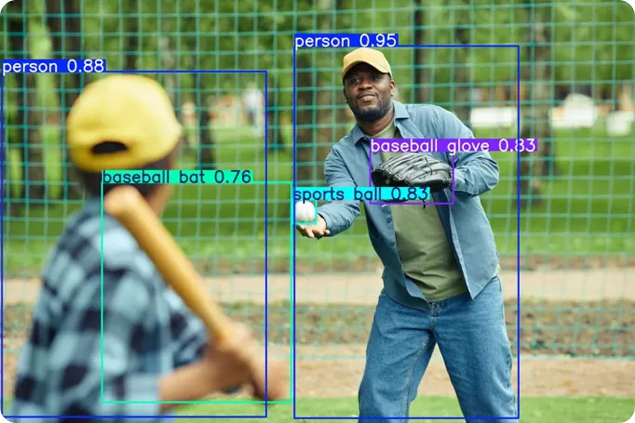 على سبيل المثال، لنفترض أننا نحلل مباراة بيسبول باستخدام تقنية الرؤية الحاسوبية. يمكن رسم مربعات حول اللاعبين والمضرب والكرة في كل إطار، مما يتيح للنموذج detect هذه الكائنات detect طوال المباراة.