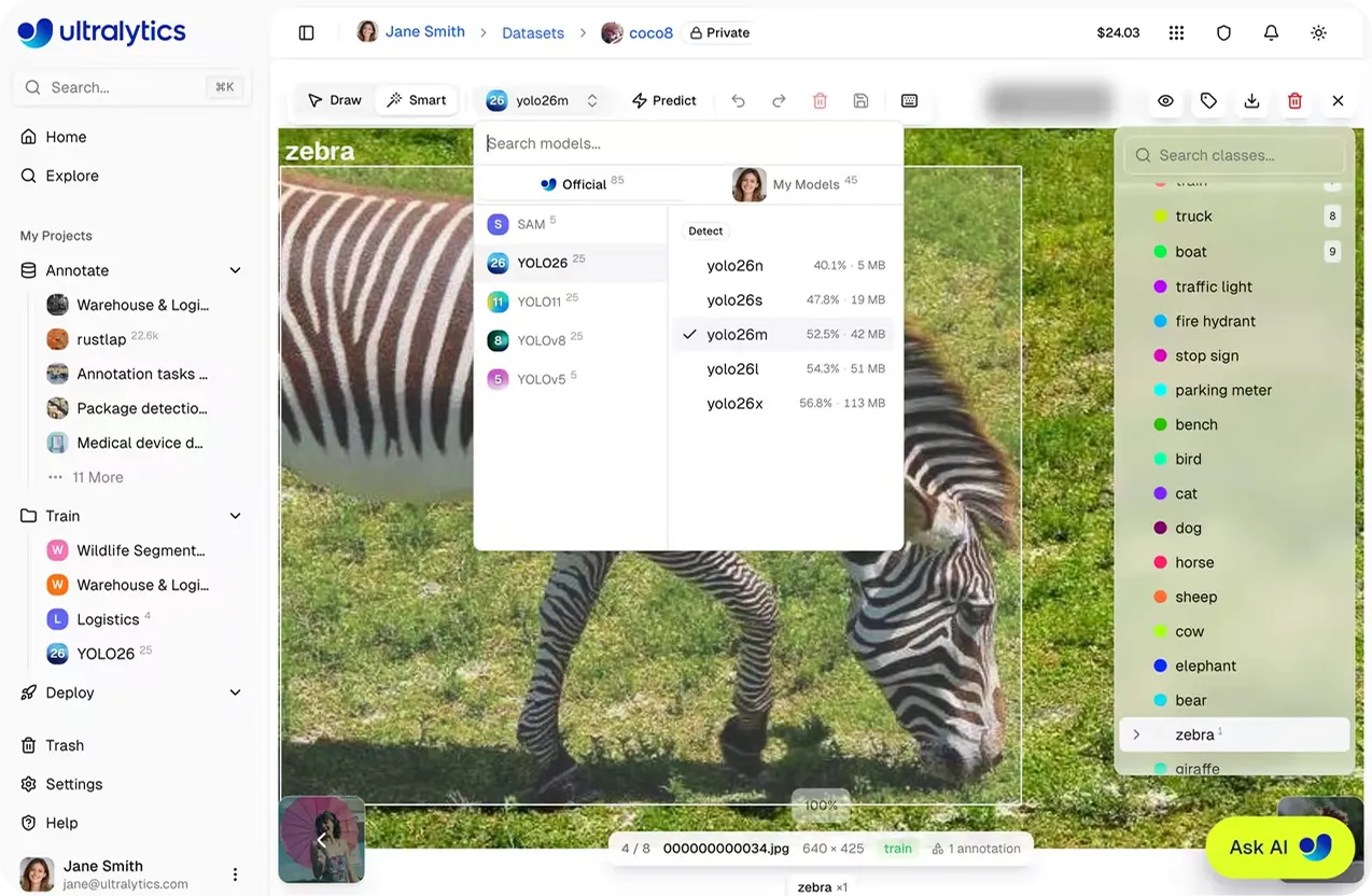 ويتمثل النهج الأكثر كفاءة في استخدام الترميز المدعوم بالذكاء الاصطناعي ضمن Ultralytics التي تستخدم الذكاء الاصطناعي لإنشاء العلامات وصقلها، مما يقلل من الجهد اليدوي مع تحسين السرعة والاتساق، كل ذلك ضمن بيئة واحدة تجمع بين إدارة مجموعات البيانات والترميز وتدريب النماذج ونشرها ومراقبتها.