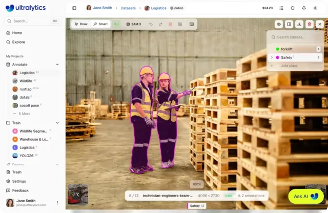 Ultralytics Platform addresses these concerns with AI-assisted annotation features powered by both Segment Anything Models (SAM) and YOLO models. SAM enables users to generate high-quality segmentation masks from simple inputs like clicks, which can then be refined into precise polygon annotations.