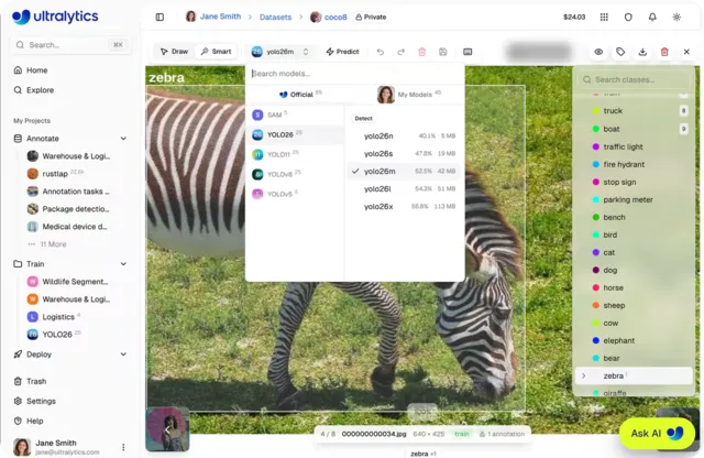 Ultralytics Platform, our new end-to-end vision AI workspace that bridges the gap between dataset management, annotation, training, deployment, and monitoring, solves this by supporting multiple annotation types and AI-assisted workflows in one seamless workspace, simplifying the entire annotation process.