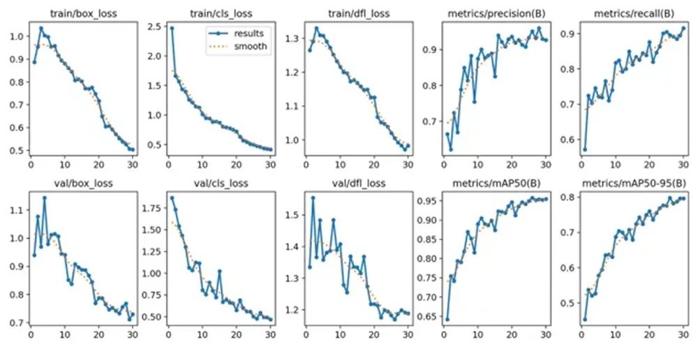 Among the saved outputs, you’ll also find graphs generated during training. These graphs show how the model improved over time. For example, they display how the loss decreased as the model learned and how evaluation metrics such as precision, recall, and mean average precision increased across epochs.