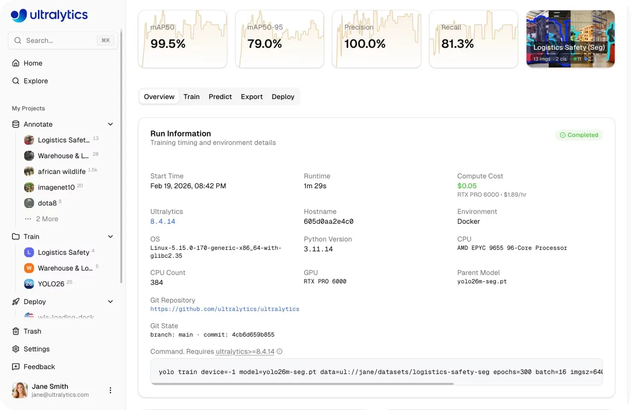 The Ultralytics Platform handles everything through managed cloud services, from provisioning resources to environment setup, orchestration, and running training jobs, so you can focus on training, experimenting, and improving your models.