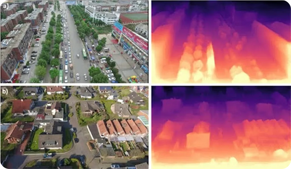 Monocular depth estimation is a simpler alternative. Using just a single RGB camera, drones can estimate depth from images and build a basic 3D understanding of their environment. This lets them detect obstacles such as buildings, trees, or sudden changes in terrain and adjust their flight path in real time.