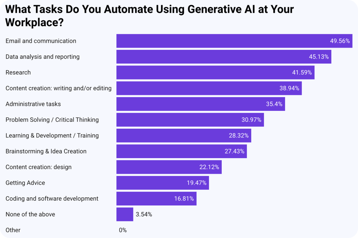 Unternehmen können KI in ihren Arbeitsabläufen einsetzen, um repetitive Aufgaben zu bewältigen und diese reibungsloser zu gestalten. KI-Bereiche wie maschinelles Lernen und Natural Language Processing (NLP) können bei allem helfen, von der Datenanalyse bis zum Kundensupport. In der Logistik kann KI beispielsweise zur Optimierung des Lagerbestands und zur Verwaltung von Lieferketten in Echtzeit eingesetzt werden, wodurch der menschliche Aufwand bei zeitaufwändigen Aufgaben reduziert wird. Durch die Übernahme dieser Funktionen kann KI auch Mitarbeiter entlasten, damit sie sich auf Aufgaben mit hoher Wirkung konzentrieren können.