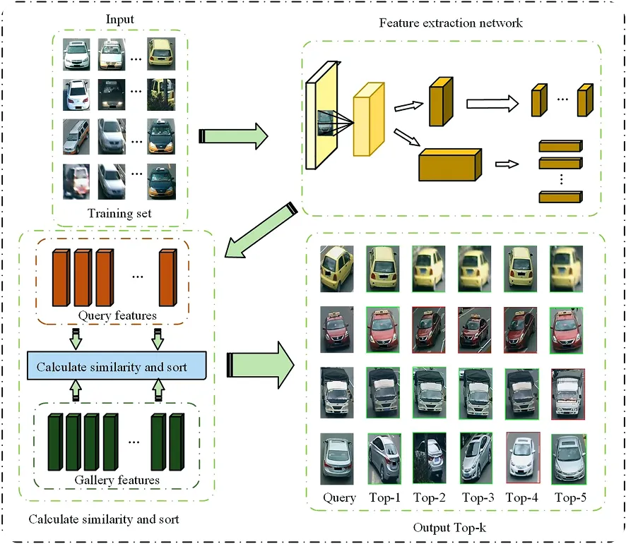 A un alto nivel, el sistema detecta primero los vehículos en cada fotograma y luego extrae características como el color, la forma y la textura para crear una representación digital única, o incrustación, para cada uno. Estas incrustaciones se comparan en el tiempo y entre cámaras, a menudo con el apoyo del seguimiento de objetos y comprobaciones espaciotemporales, para decidir si dos avistamientos pertenecen al mismo vehículo.