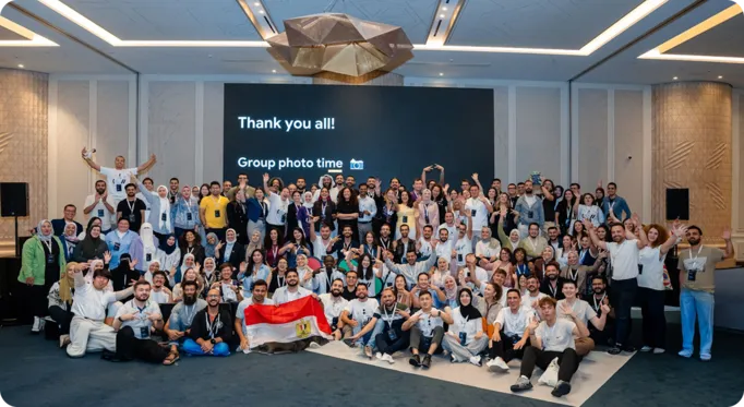Fig 5. Photo de groupe de l'ensemble du GDG et des Googlers à la clôture de l'événement. Image prise par les photographes du GDG MENAT.