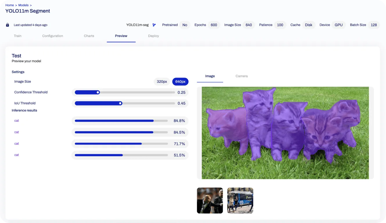 Pour exécuter l'inférence sur des images, il vous suffit de créer un compte, d'aller dans la section « Modèles » et de sélectionner la variante du modèle de segmentation d'instance YOLO11 de votre choix. Vous pouvez télécharger une image et afficher les résultats de la prédiction dans la section d'aperçu, comme indiqué ci-dessous.