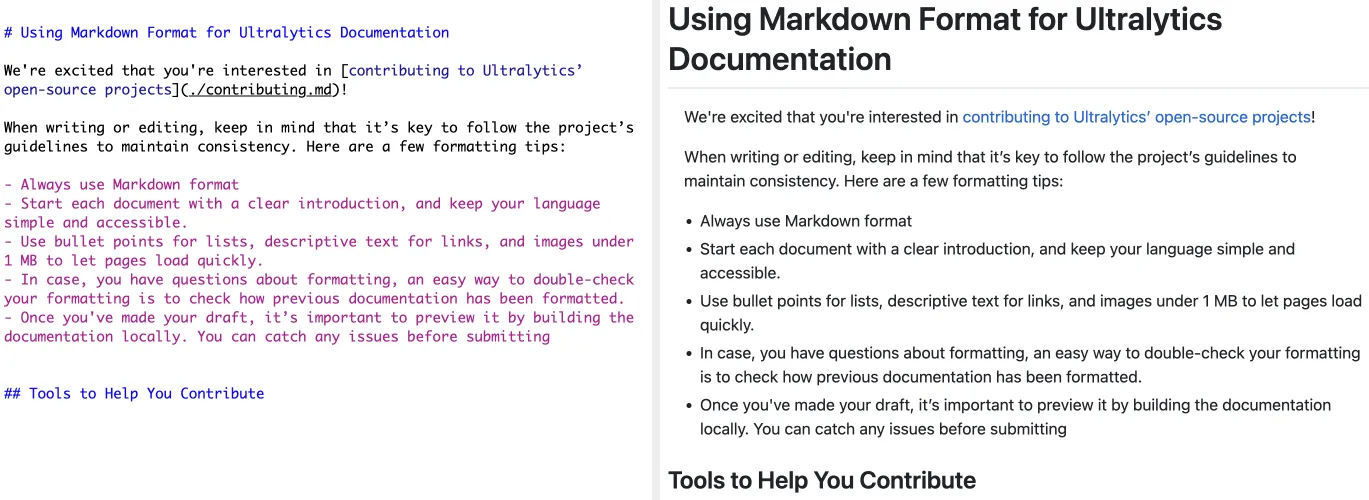 Lorsque vous contribuez à la documentation d'Ultralytics, assurez-vous de consulter la documentation existante et de vérifier s'il existe des problèmes ou des discussions qui mettent en évidence les points à améliorer. Cela permet de s'assurer que vos contributions sont axées sur les domaines où elles sont le plus nécessaires.