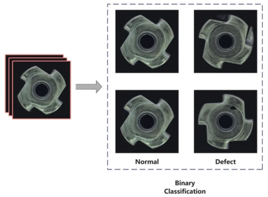 이진 분류는 이미지를 두 가지 클래스 중 하나로 분류하는 작업, 예를 들어 객체에 결함이 있는지 여부를 결정하는 것을 의미합니다.