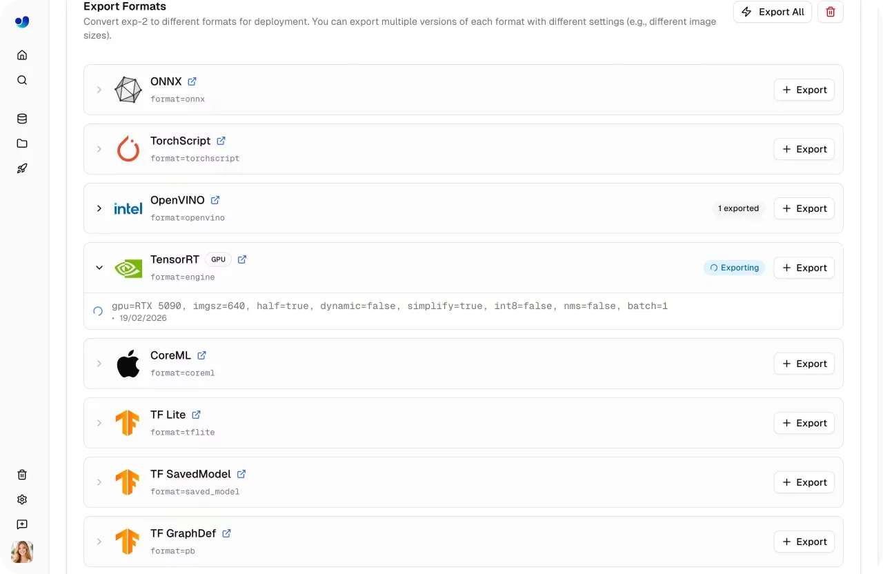 Por fim, quando o sistema apresenta um bom desempenho, pode ser implementado em produção. Ultralytics permite exportar modelos para vários formatos ou implementá-los através de serviços de inferência e pontos finais, para que possam ser executados em ambientes reais.