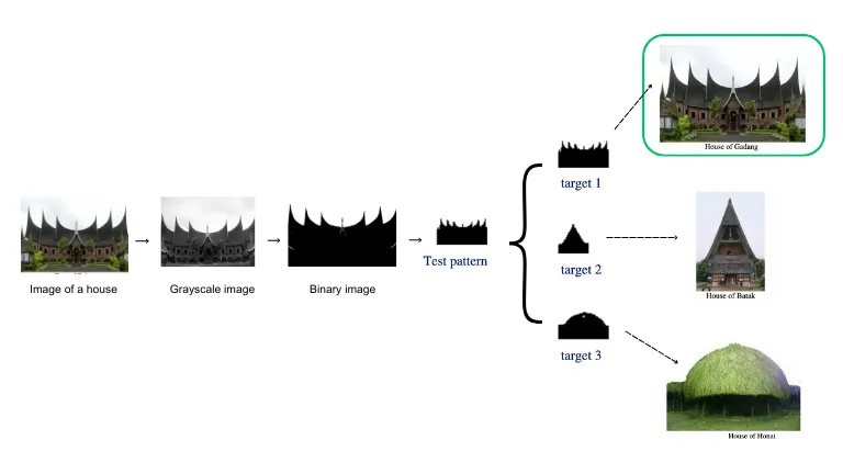 Um exemplo interessante vem de um estudo relacionado com casas tradicionais indonésias. Os investigadores criaram pequenos modelos com características típicas e compararam-nos com fotografias em tamanho real. Esta abordagem foi utilizada para destacar regiões da imagem que correspondiam estreitamente ao modelo e classify estilos classify em diferentes regiões.