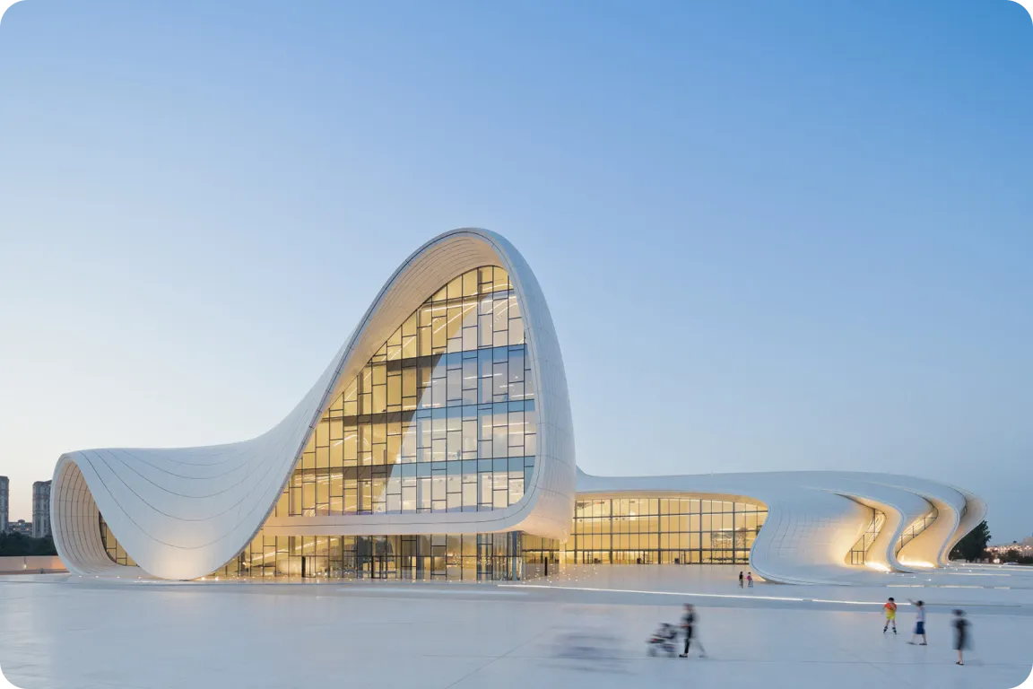 Центр Гейдара Алиева в Баку, Азербайджан, был спроектирован Захой Хадид и завершен в 2012 году. Он показывает, как генеративный дизайн и инструменты ИИ меняют архитектуру. Плавная, изогнутая форма здания не похожа на традиционные прямые линии. Дизайн отражает современный и прогрессивный дух Азербайджана. Ранние инструменты генеративного дизайна от Autodesk и Rhino сыграли ключевую роль в создании этой сложной архитектуры.