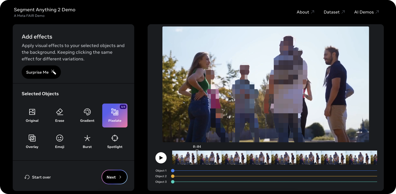 Segment Anything 2 Demo — отличный способ опробовать модель на видео. Используя возможности PVS SAM 2, мы взяли старое видео Ultralytics на YouTube и смогли сегментировать три объекта или человека в видео и пикселизировать их. Традиционно редактирование трех человек из видео подобного рода было бы трудоемким и утомительным и потребовало бы ручного маскирования каждого кадра. Однако SAM 2 упрощает этот процесс. С помощью нескольких щелчков мыши в демоверсии вы можете защитить личность трех интересующих объектов за считанные секунды.