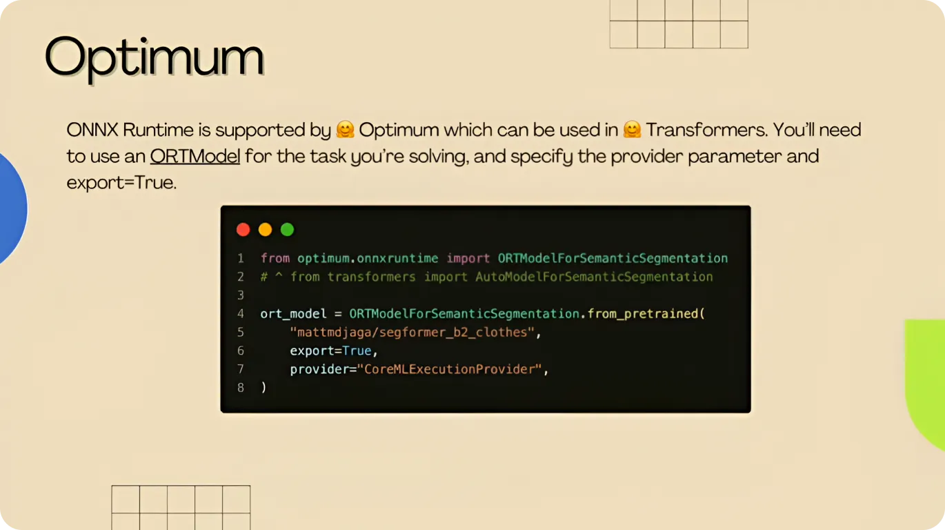 Чтобы еще больше повысить эффективность, Павел представил библиотеку Hugging Face Optimum, набор инструментов, предназначенных для оптимизации и развертывания моделей. Всего с помощью нескольких строк кода разработчики могут применять методы квантования и преобразовывать модели в эффективные форматы, такие как ONNX (Open Neural Network Exchange), что позволяет им бесперебойно работать на различных типах оборудования, включая облачные серверы и периферийные устройства.