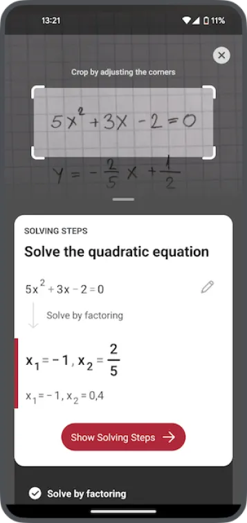 Şekil 2. İkinci dereceden bir denklemi çözmek için Photomath uygulamasını kullanma örneği.