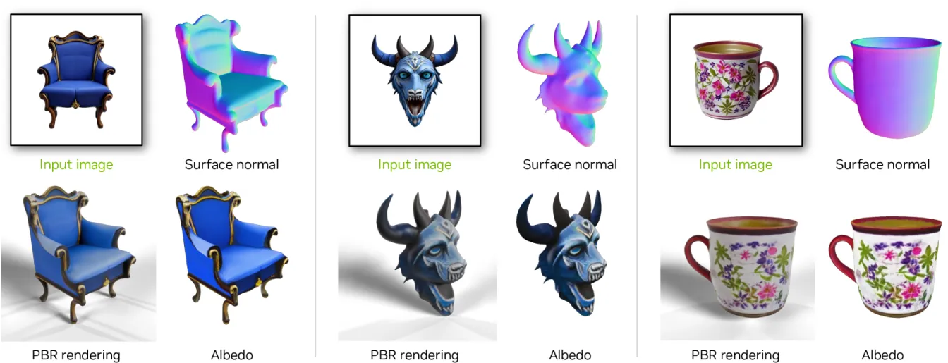 Aynı zamanda, çoklu görüntü ControlNet (üretim sürecini yapısal bilgilerle yönlendirmek için tasarlanmış bir sinir ağı), nesnenin yüzeyinin şeklini ve yapısını temsil eden yüzey normalleri üretir; buna eğriler ve kenarlar gibi ayrıntılar da dahildir. Bu yüzey normalleri, RGB görüntüleriyle birleştiğinde hem görsel hem de geometrik bilgi sağlar. Bu veriler, nesnenin 3B şeklini, dokularını ve malzemelerini tahmin etmek için bilgi dizilerini işleyen bir tür yapay zeka modeli olan bir Transformer tabanlı yeniden yapılandırma modeline aktarılır.