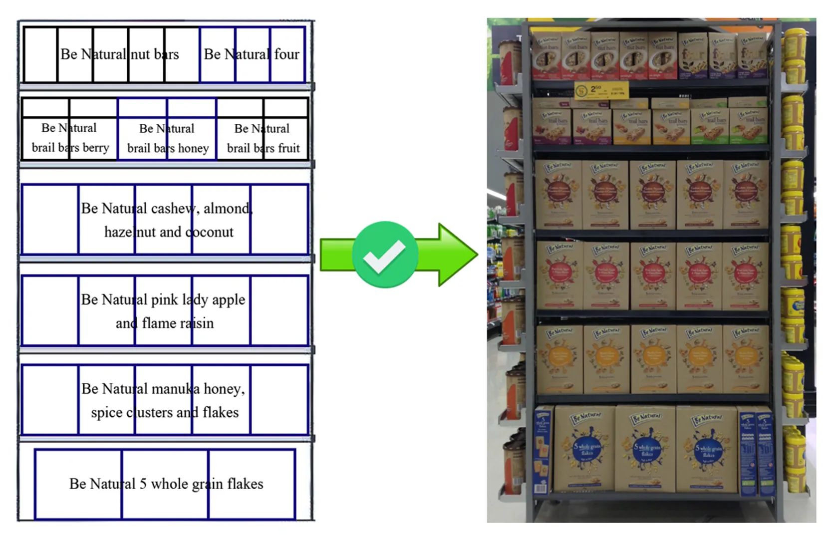 Bu yapılandırılmış düzen daha sonra beklenen planogramla karşılaştırılır. Sistem, doğru SKU’ların doğru konumlarda olup olmadığını, gerekli raf yüzü sayısının korunup korunmadığını ve eksik veya yanlış yerleştirilmiş ürün olup olmadığını kontrol eder.