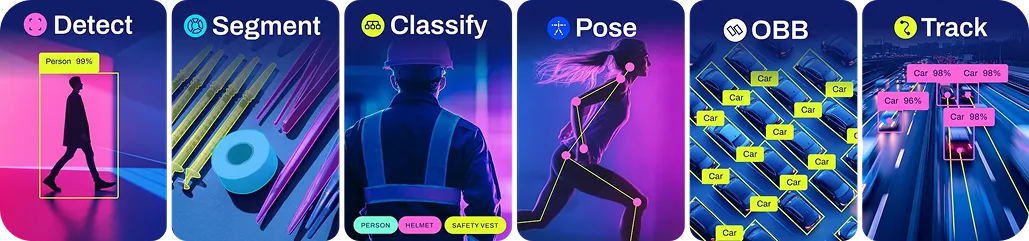 Các tác vụ thị giác máy tính được hỗ trợ bởi các mô hình thị giác máy tính đã được huấn luyện, học hỏi từ các tập dữ liệu lớn và áp dụng kiến thức đó vào các cảnh quay thực tế. Ví dụ: Ultralytics YOLO Các mô hình, chẳng hạn như YOLO26 , hỗ trợ nhiều tác vụ trong môi trường thời gian thực.