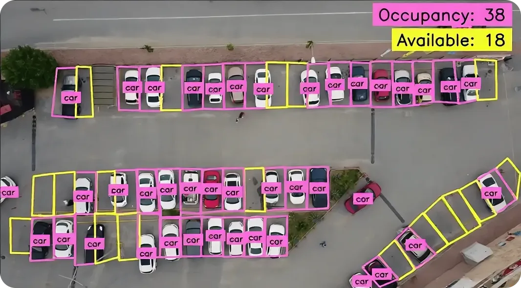 Các mô hình thị giác có thể detect Phân vùng không gian trống và có người đỗ, giúp người lái xe nhanh chóng và hiệu quả tìm được chỗ đỗ xe. Chúng thường được sử dụng trong các trung tâm thương mại, sân bay, khu phức hợp văn phòng và trung tâm thành phố để nâng cao hiệu quả đỗ xe.