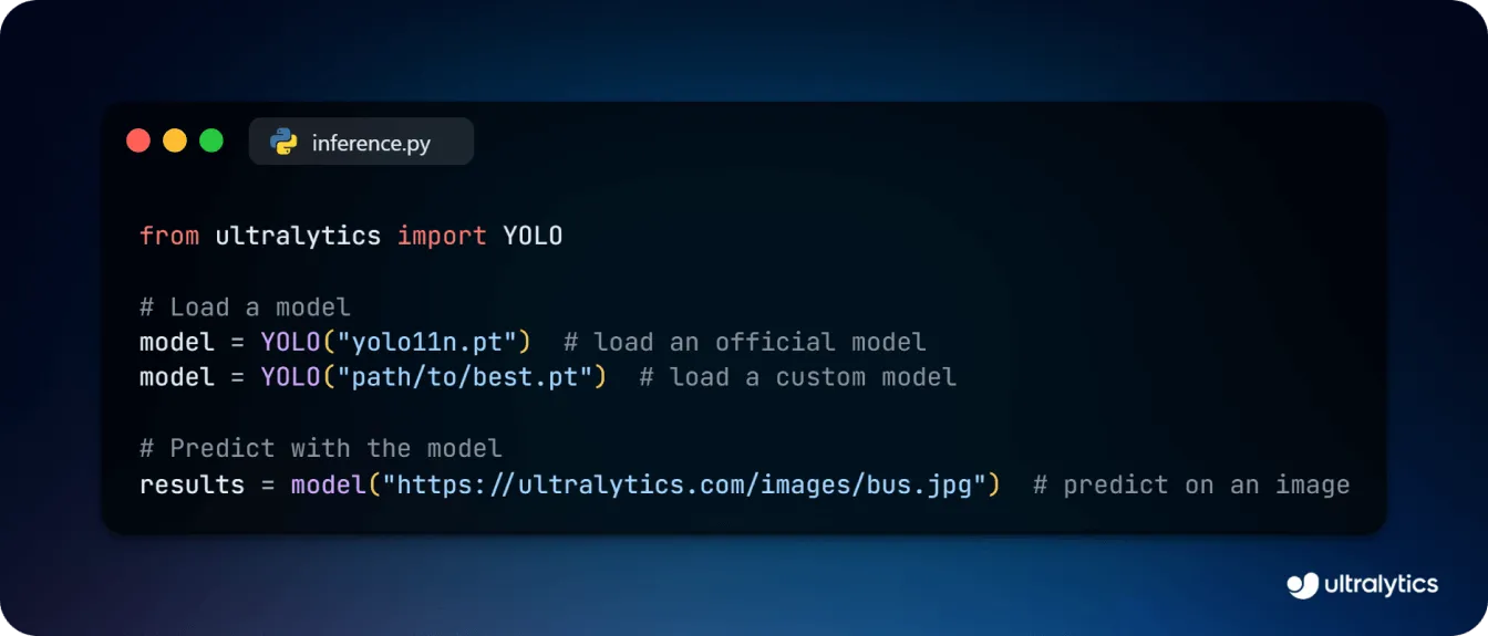 Để thực hiện suy luận (infer) bằng mô hình phát hiện đối tượng YOLO11, trước tiên bạn cần cài đặt gói Ultralytics Python thông qua pip, conda hoặc Docker. Nếu bạn gặp bất kỳ sự cố cài đặt nào, hãy xem hướng dẫn khắc phục sự cố để biết các mẹo và thủ thuật giúp bạn giải quyết chúng. Sau khi cài đặt, bạn có thể sử dụng đoạn mã sau để tải mô hình phát hiện đối tượng YOLO11 và đưa ra dự đoán trên một hình ảnh.